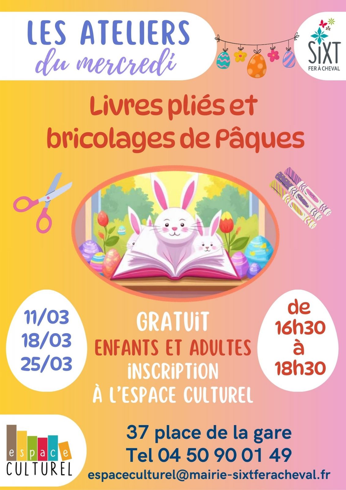 Participez aux ateliers du mercredi pour créer des livres pliés et des bricolages sur le thème de Pâques. Activité gratuite pour enfants et adultes, inscription à l'Espace Culturel.